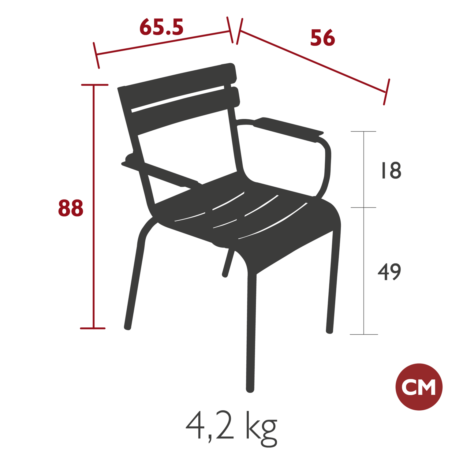 Dimensions: depth 56cm, width 65.5cm, height 88cm, seat height 49cm, armrest 67cm.