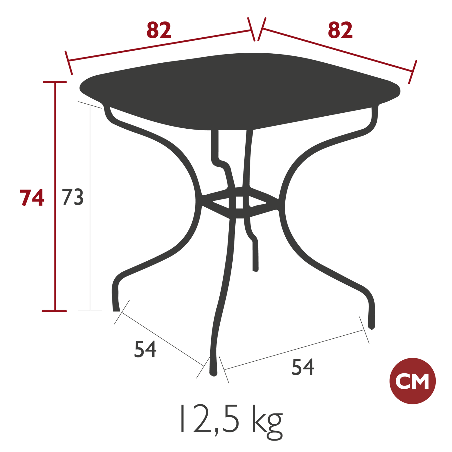 Dimensions: length 82cm, width 82cm, height 74cm, tabletop underside height 73cm.