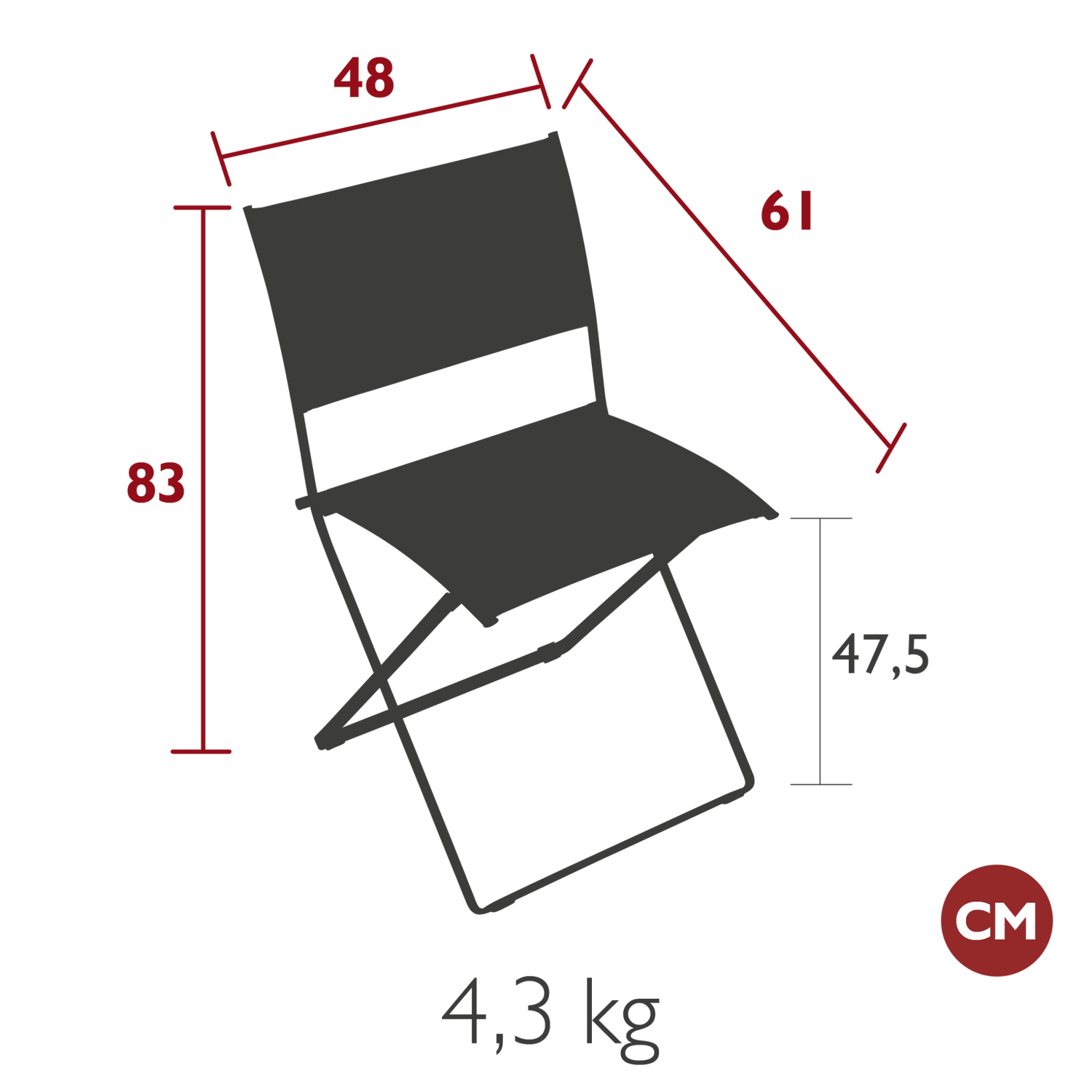 Dimensions: depth 61cm, width 48cm, height 83cm, seat height 47.5cm, armrest height 68cm.