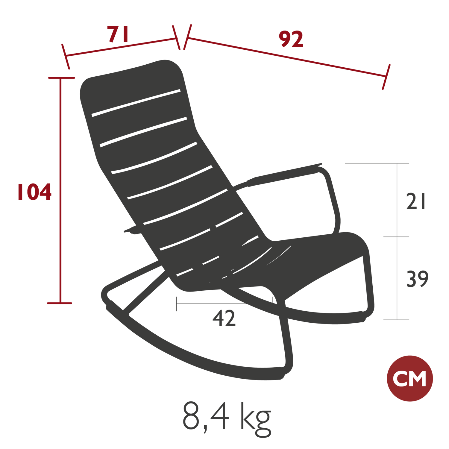Dimensions: depth 92cm, width 71cm, height 104cm, seat height 39cm, armrest height 60cm.
