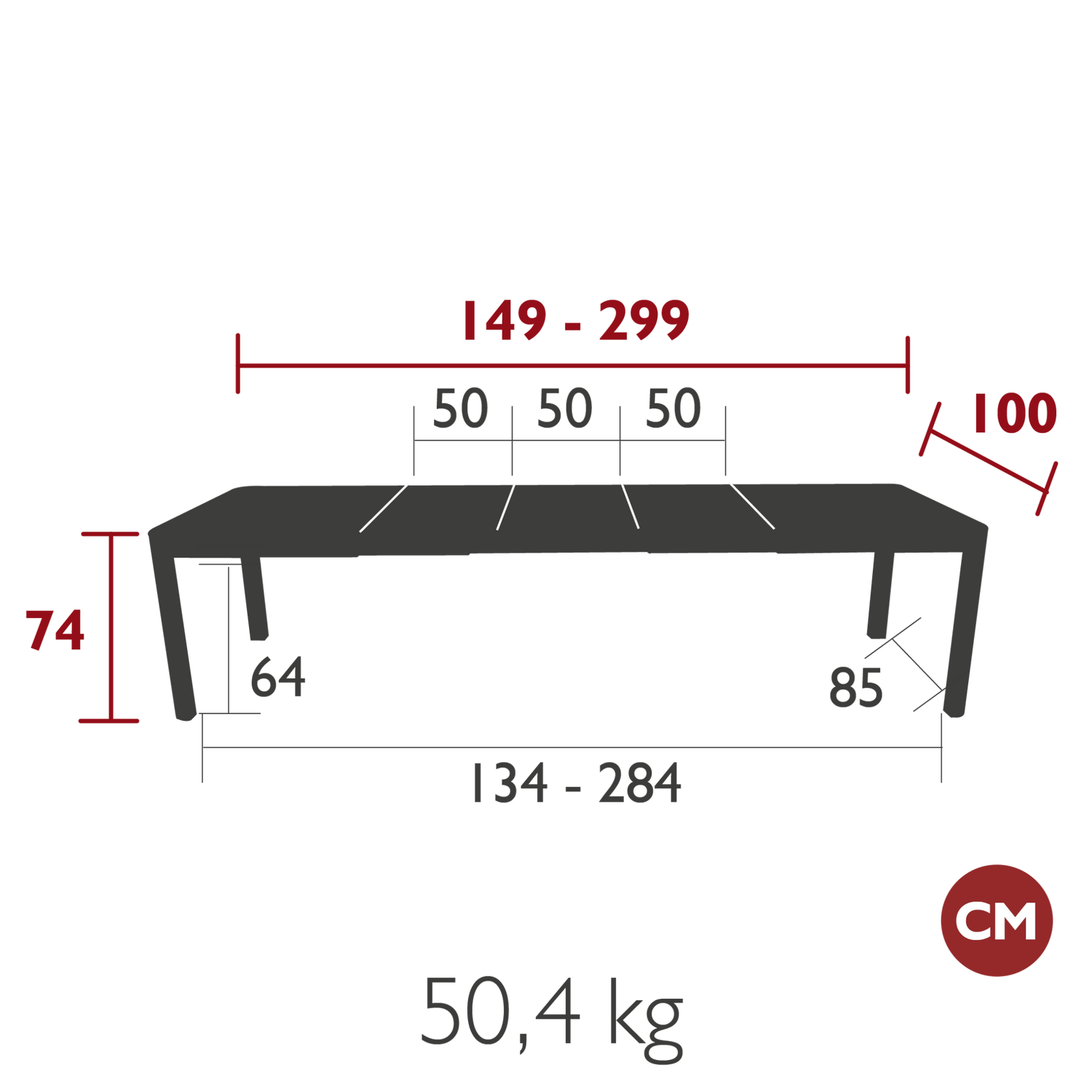 Dimensions: length 149-299cm, width 100cm, height 74cm, tabletop underside height 64cm.