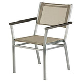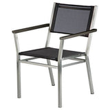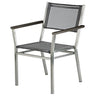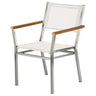 The Equinox Dining Armchair is constructed from stainless steel with a Textilene or teak back and sling, and powder coated or teak armrests. It can be stacked for easy storage, making it a perfect chair for gardens with limited space. It is also ideal for use in coastal areas where oxidation may be an issue.