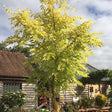 This deciduous small tree has rich yellow foliage and white pea like flowers in summer and autumn. Performs best in full sun in well drained soil.