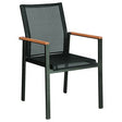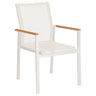 This armchair has a powder coated aluminium frame with teak accenting on the arms and Textilene® slings for comfort. The chairs can be stacked if required.