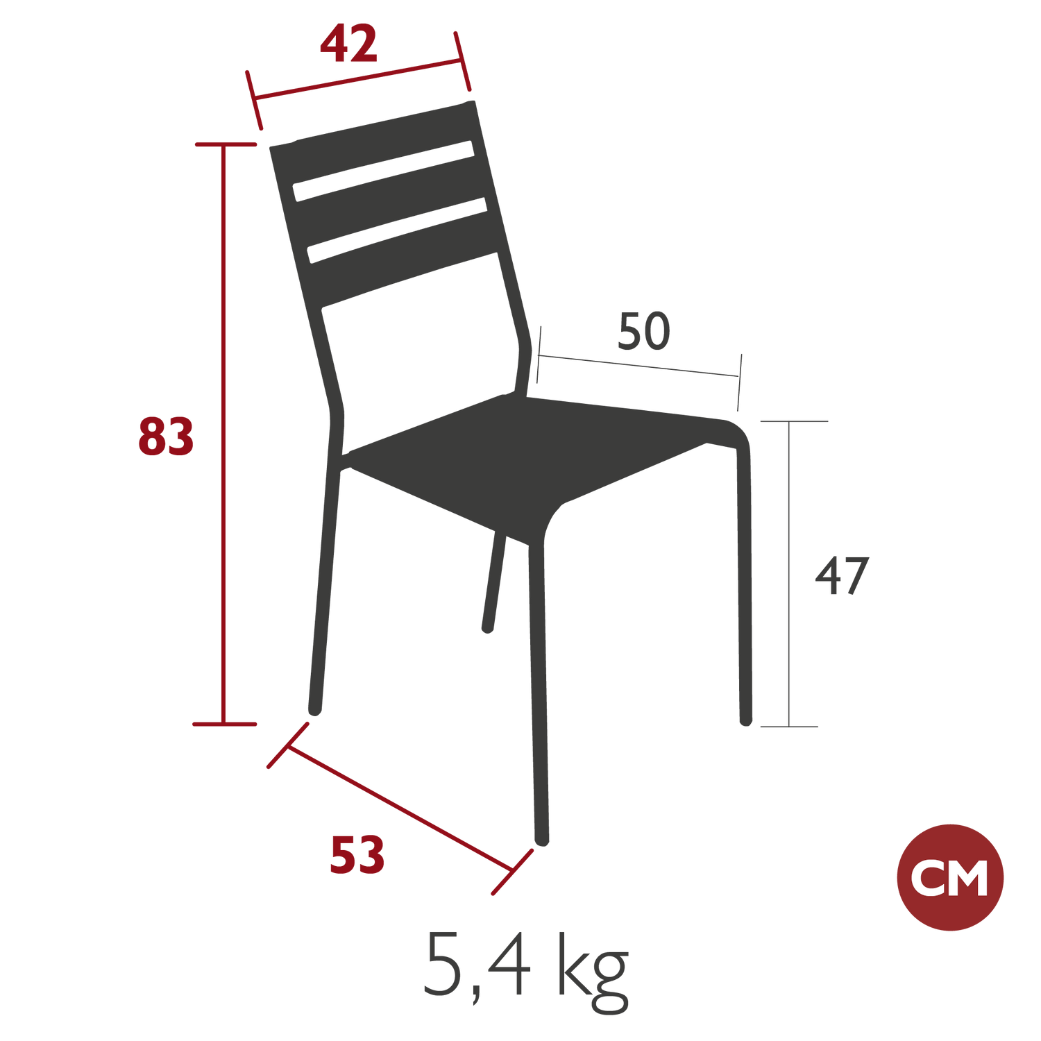 Dimensions: width 42cm, depth 53cm, height 83cm, seat depth 50cm, seat height 47cm.