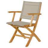 The Horizon Dining Carver Chair is constructed from teak with a textilene sling. Teak is very stable and rot resistant, making this a low maintenance garden chair. It can be folded for easy storage, making it ideal for gardens with limited space. It also has a lock mechanism for safety.