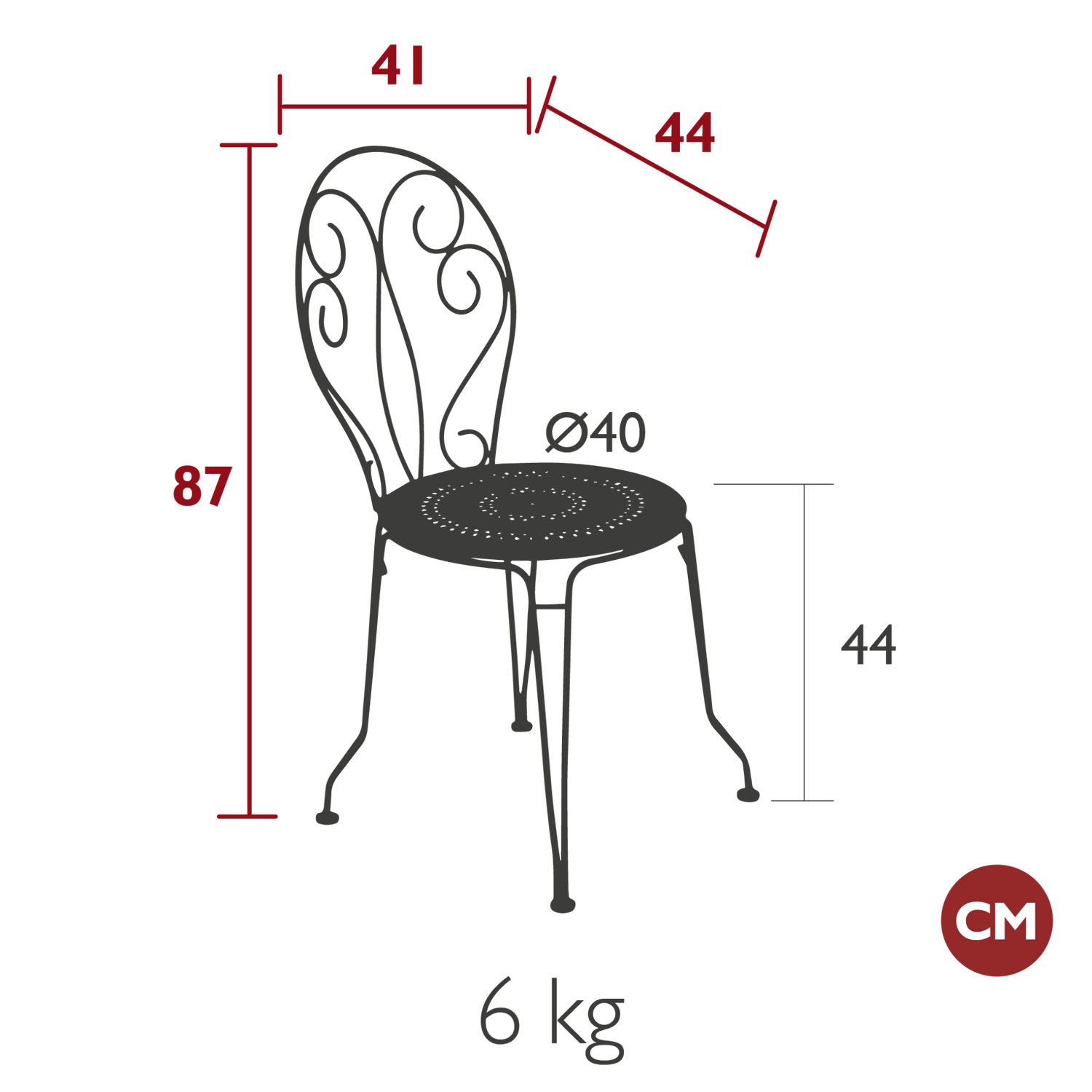 Dimensions: depth 44cm, width 41cm, height 87cm, seat height 44cm.