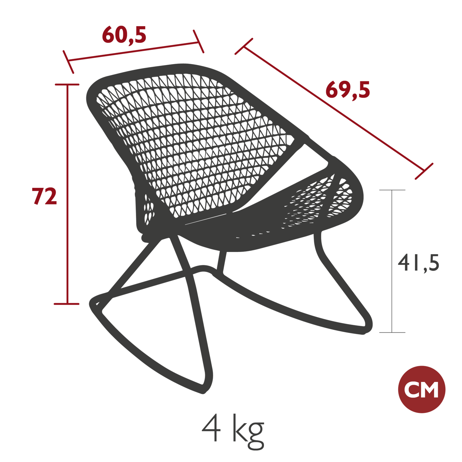 Dimensions: depth 69.5cm, width 60.5cm, height 72cm, seat height 41.5cm.